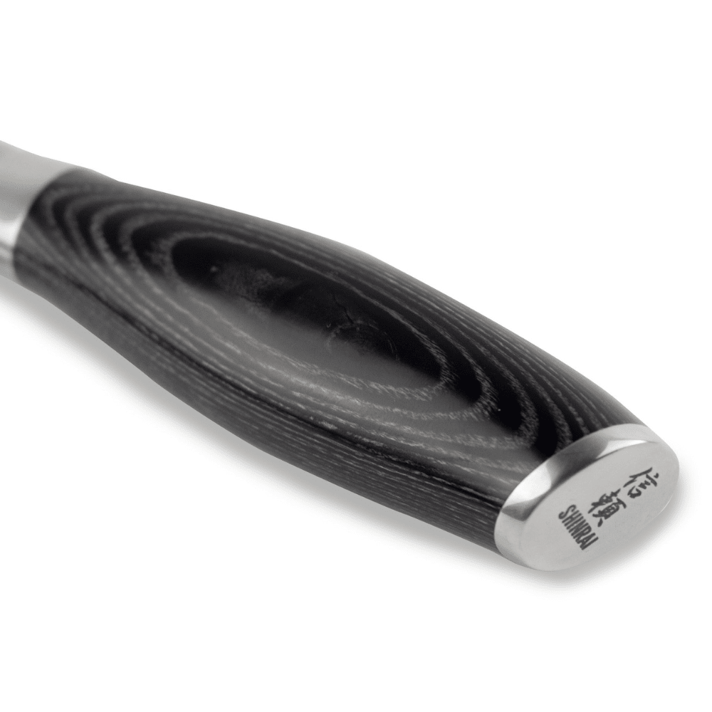 Die Pakkaholz-Serie zeichnet sich durch ihre edle Verarbeitung und ihr ergonomisches Design aus. Die Klinge aus Damaszenerstahl geht nahtlos in einen Stahlkropf und einen elegant geschwungenen Griff aus Pakkaholz über. Dieses Holz ist wartungsfrei, verschleißfest und bietet hervorragenden Halt. Ein dezentes Shinrai-Logo an der Griffspitze unterstreicht die Handwerkskunst dieser Serie.