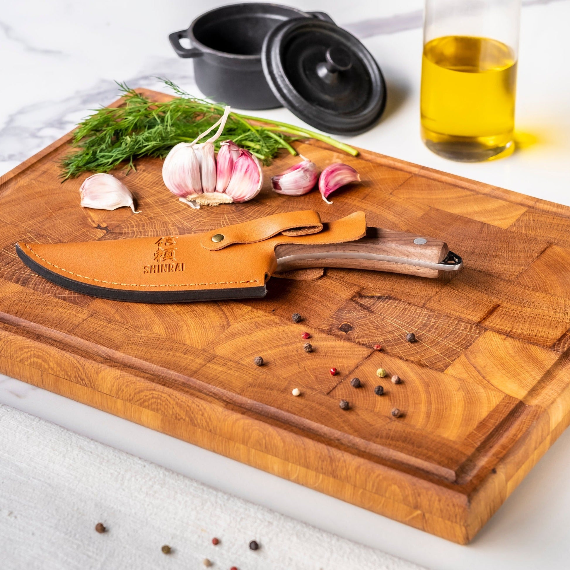 Das Gladiator-Kochmesser aus gehämmertem Edelstahl mit Holster besticht nicht nur durch sein Aussehen, sondern auch durch seine hervorragenden Eigenschaften. Die handgehämmerte Stahlklinge geht in einen schönen Massivholzgriff über. Die Klinge wird handgehämmert, eine Technik namens Tsuchime . Dies sorgt nicht nur für hohe Schärfe und ein schönes Aussehen, sondern verhindert auch, dass Ihr Besteck an der Klinge kleben bleibt.